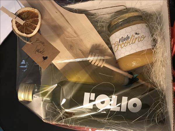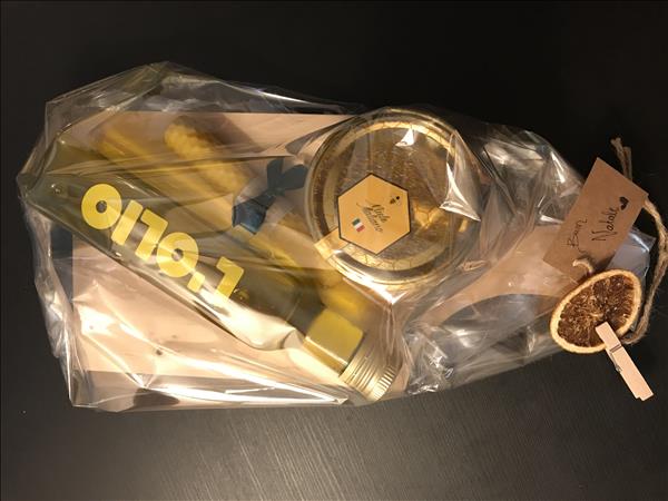 Pacco di Natale con: tagliere grande, 500g di miele millefiori, una bottiglia da 250ml di olio extravergine di olive, una candela di cera d'api